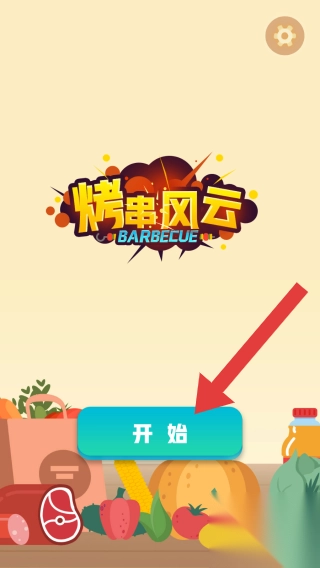 1. 页面右上角设有设置齿轮图标,底部展示各类食材(如肉、蔬菜等),以此凸显烧烤经营主题。需点击【开始】按钮,才能进入。