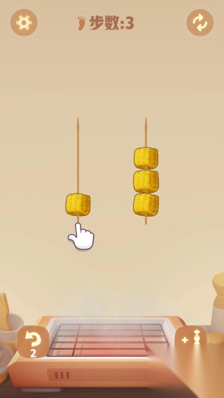 3、显示步数:3,有两串玉米烤串、烤炉、功能按钮(设置、重置、下方的道具按钮等),呈现烧烤制作的具体玩法,需在有限步数内完成烤串操作。