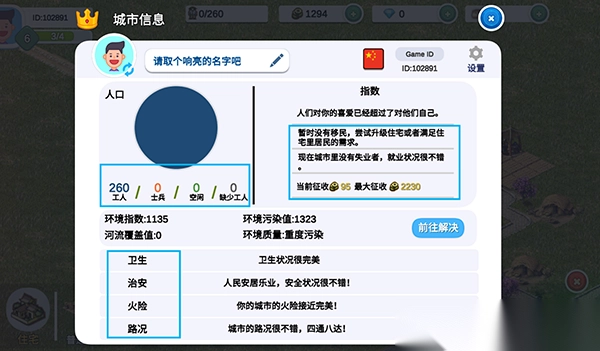 5、点击个人头像,可以看到城中居民的满意度、城市的一些基本情况,如卫生、治安、火险以及路况等。