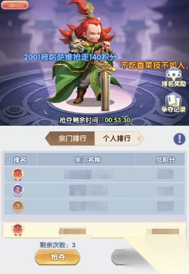 每天14:00-20:00可以对其他宗门成员进行抢夺。每人每天可以抢夺3次,每次抢夺会有2分钟的冷却时间。抢夺并战胜其他宗门成员可获得对方25%的当前积分。