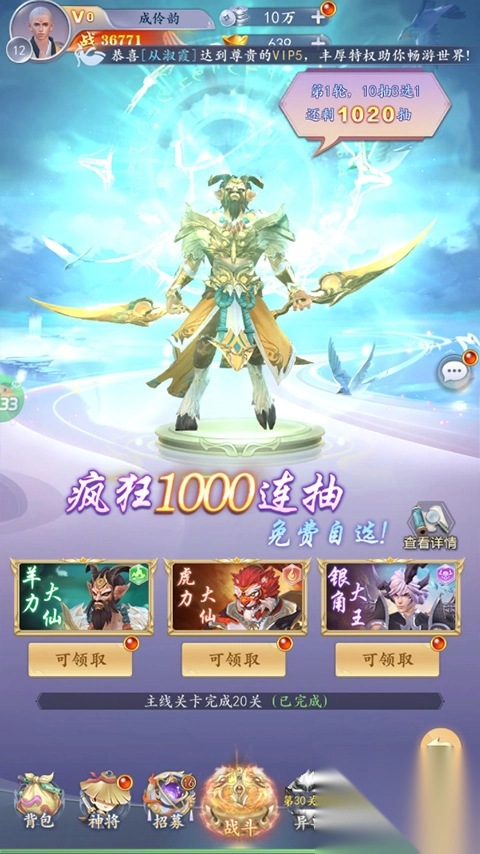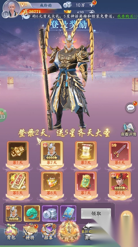 1、只要连续登录,就能免费获得五星齐天大圣!这一强力神将,助你在推图过程中轻松无压力。