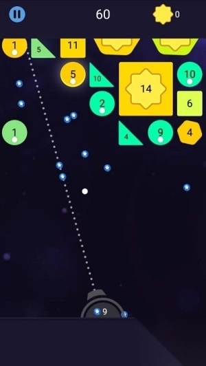 1. 玩家依靠滑动屏幕操控炮台角度,发射小球去击碎上方持续下落的方块,避免方块越过危险警戒线。