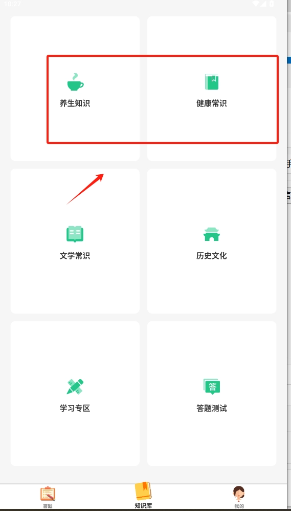 2、点击养生知识卡片开始答题,或者切换其他知识分类。