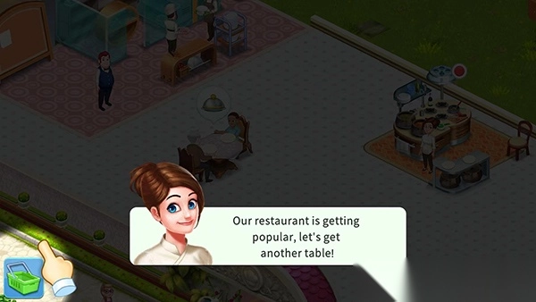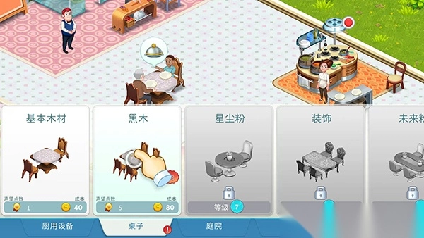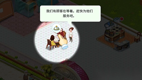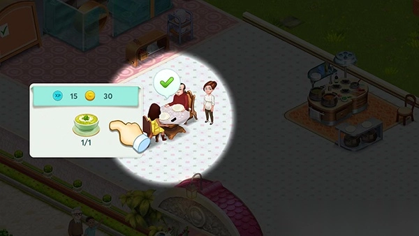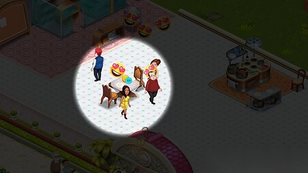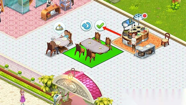 9、在餐厅界面移动,找到合适位置后,点击【打勾】图标,就算放置完成。随后便持续为顾客提供餐食,并装饰自己的餐厅。以上便是《明星厨师2》烹饪游戏的攻略。