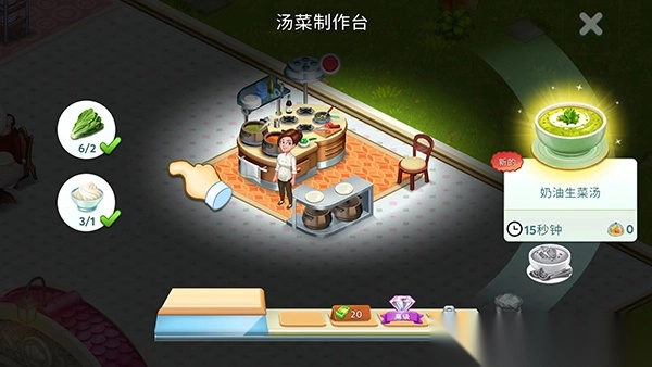 3、来到汤菜制作台,可看到顾客点的餐品,依次将餐品拖动到制作台上,然后点击【加速】选项,