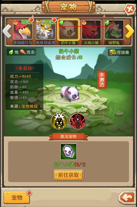 1、游戏内宠物有风、火、水、地四种属性类型,每种宠物都有专属技能和属性。