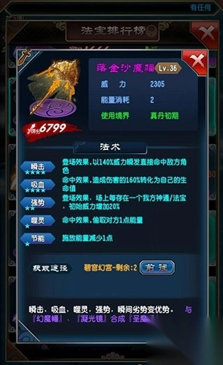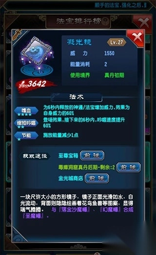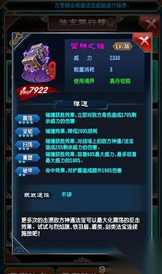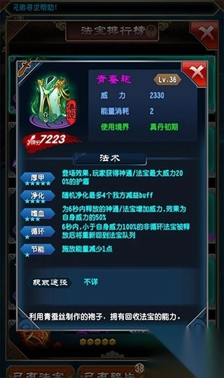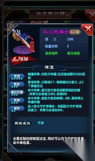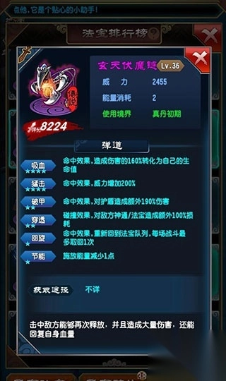 用途:这个法宝,我很少用,但斗法场里面的表现前期是不俗的,在震荡体修偏低的情况下还是有一战之地。不过我主要是用来过历程。