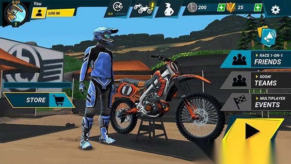 1. 于本站完成疯狂特技摩托车3最新版本的下载与安装后,打开程序进入大厅页面。页面左侧的“store”代表商店,上方分别展示着摩托车型号和车手信息,左上角为个人中心,点击进入能够查看详情以及战绩。