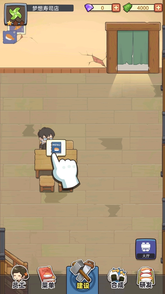 1、第一步,在本站完成下载安装后,打开游戏。此时,玩家要和小野凉太一同经营一家寿司店。先将店铺打扫干净,使其能够正常运作。打扫完毕后,点击【建设】,去购置桌椅以及厨房设施。
