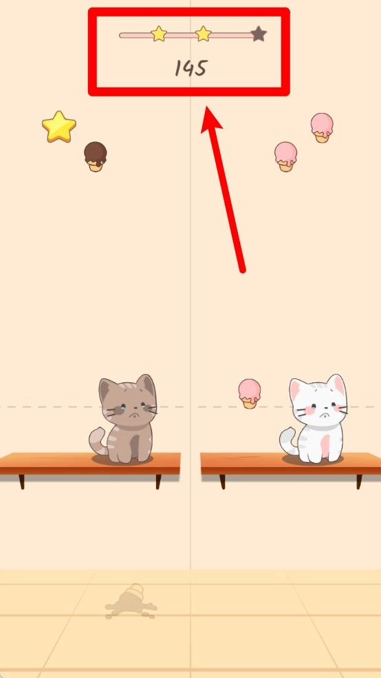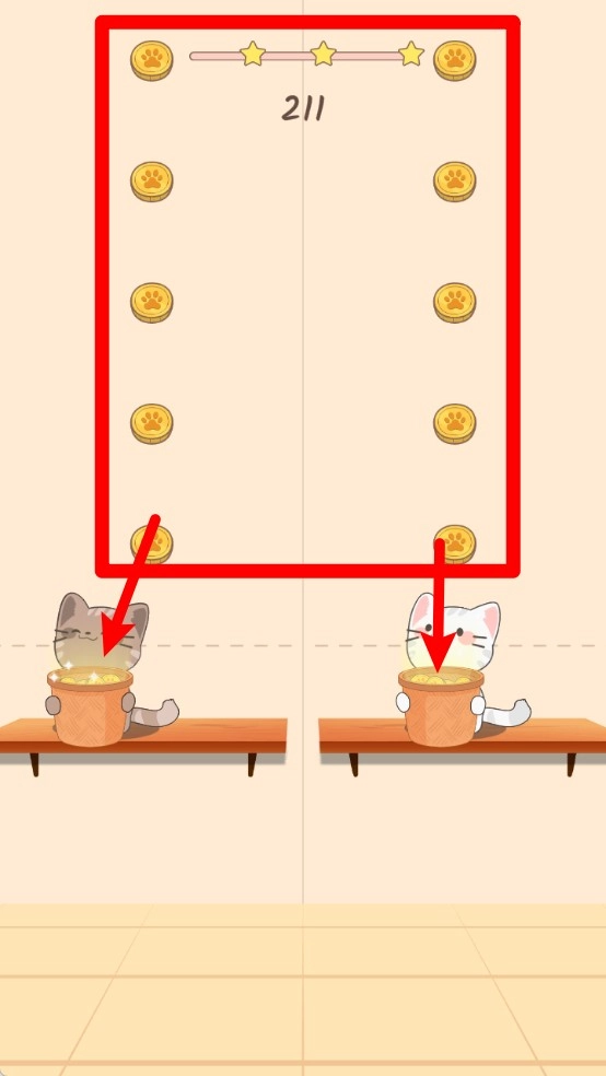 1. 双猫同步接物玩法:玩家要操控左右两只猫咪做出一致动作,只有精准接住掉落的食物,才能顺利积累分数并获得星级评价。