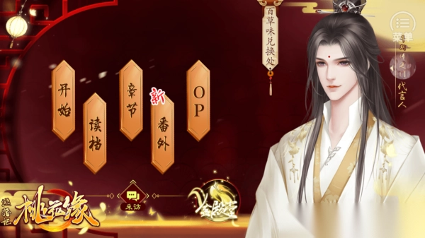 1. 点击【开始】,即可开启《逃婚记・桃花缘》全新剧情。若想续玩,选择【读档】;若要查看章节点,点击【章节】;要是想体验额外内容,则选择【番外】。