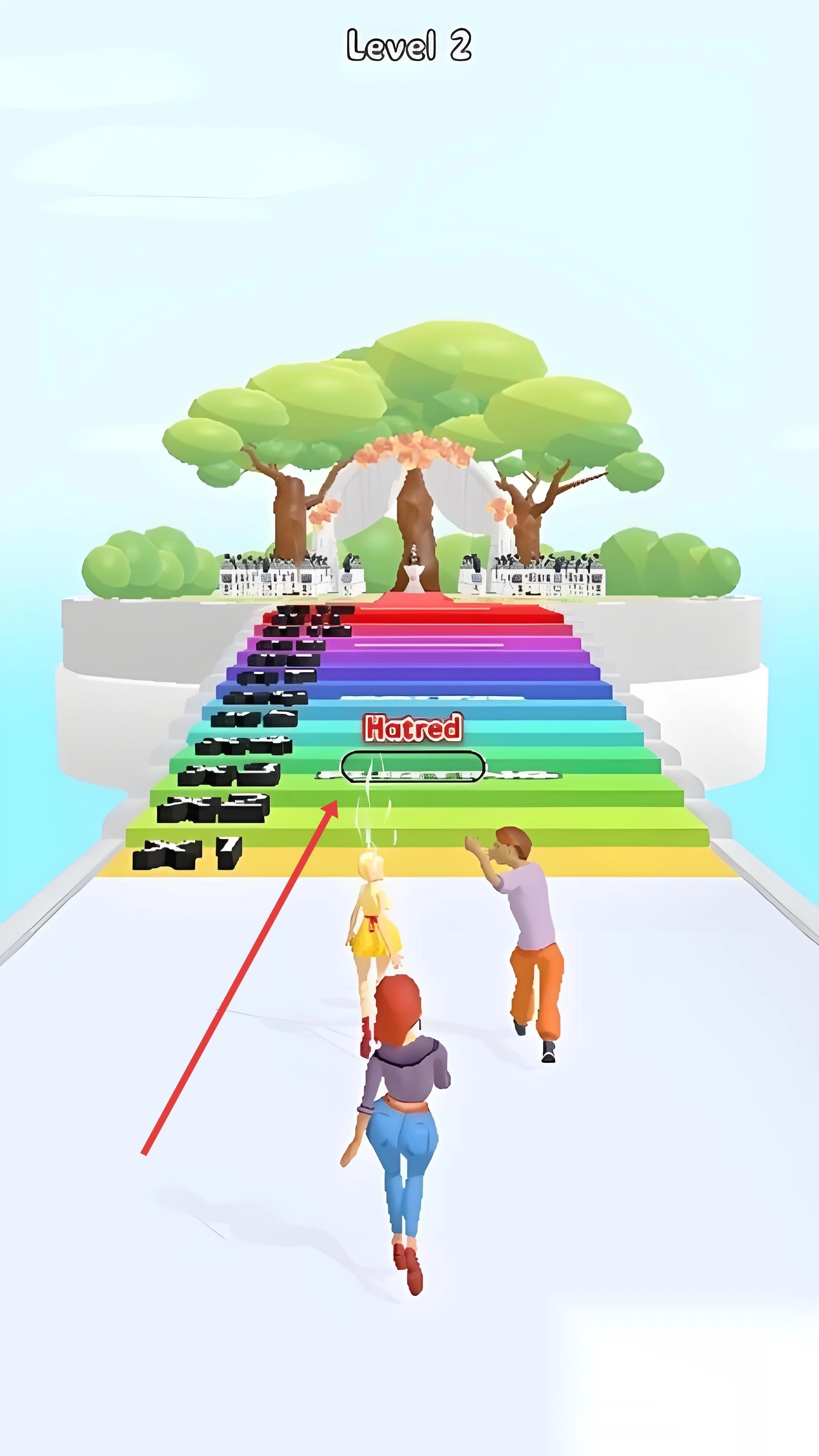 1. 进入游戏之后,跟着夫妇一起移动,留意前方大门的颜色以及相关提示,通过滑动屏幕来操控角色加速奔跑,做好穿越相应大门的准备。