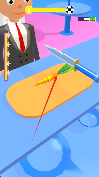 3、当成功通关全部常规关卡后,即可开启星级厨师考核的挑战。在规定的限定时间内,需把复杂的食材切割成指定的形状,完成这一任务后就能解锁黄金厨具套装。
