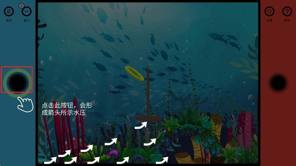 1. 游戏开始时,我们点击左边的黑色按钮,这样就会触发箭头所指的水压,在水压作用下,黄色圆环会顺着水流方向朝着中间的杆子移动。
