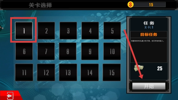 2、在关卡选择界面选关卡1,再次点击右侧开始按钮,随后进入该关卡的战斗任务。