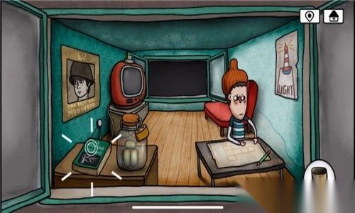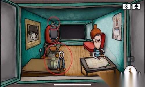9)再度来到涂鸦小男孩的房间,使用钳子打开玻璃罐,获取蜣螂,把天线安装到电视机上,电视所呈现的内容提示了挖出太阳符石的位置。