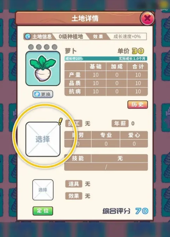 3、随后在“土地详情”窗口里,点击下方的【选择】按键,给这块土地挑选合适的员工。