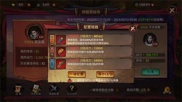 当自己的战力高于对手20%并且高出的战力大于100万并且自己排名高于对手时可以扫荡对手,扫荡可以跳过战斗直接展示战斗结果。