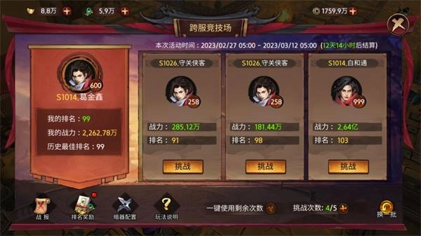 以上就是跨服竞技场的玩法攻略啦~祝各位大侠都能榜上有名哦~