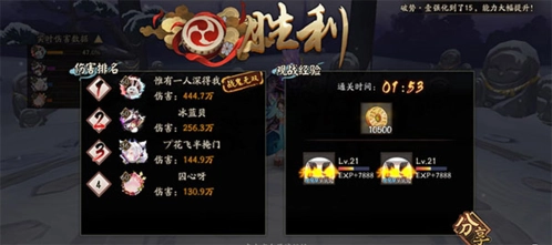 鉴于挑战中怪物数量较多,建议选用群攻式神,能快速清理小怪,铃鹿御前是目前最佳之选。搭配千姬与缘结神,待增益叠满后,便可打出爆炸伤害。要是没有铃鹿御前,大天狗、泷夜叉姬等群攻式神亦可替代。此外,boss有个特性,阴阳师大人在目标处于冰冻或深度冰冻状态时,造成的伤害会分别提升30%和50%,因此,配备一个雪幽魂清姬是不错的选择,其二号位属性选速度,四号位选命中。