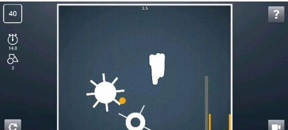 第40关操作指引:在画面的最顶部绘制一块石头,并使其瞄准右下方的齿轮杆子。当计时器显示为2.3秒时,松开操作,让石头砸落下去。