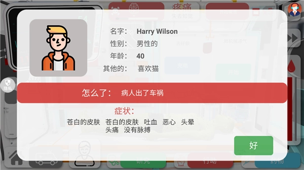 1、进入游戏后,接诊一位遭遇车祸的病人,留意病人的症状。