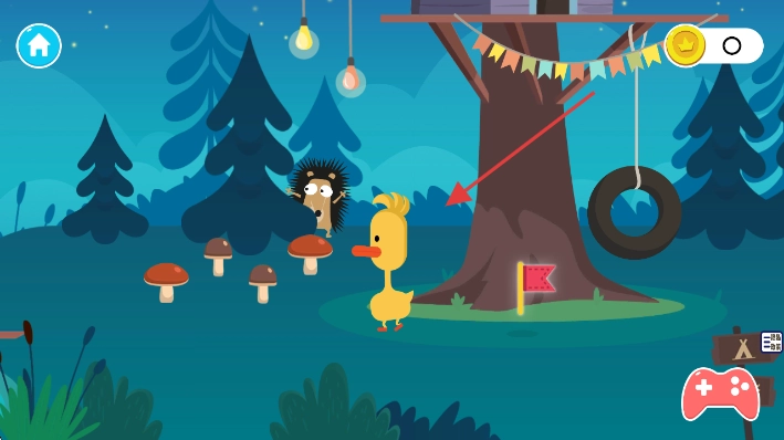3、操控黄色鸭子角色,在树屋森林场景中自由移动,与环境元素(如蘑菇、刺猬、树屋)交互,推进探索任务或剧情进程。