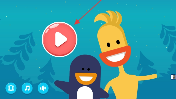 2、进入角色互动界面(黄色鸭子与紫色企鹅形象),点击中间红色播放按钮,触发游戏内的动画、关卡或互动模式。