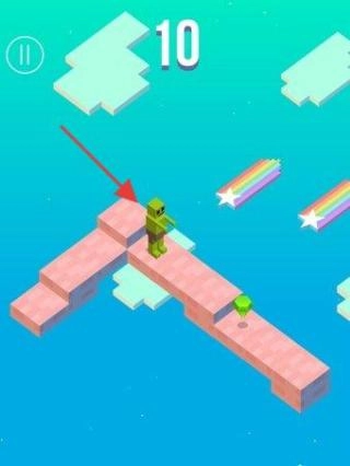 2、游戏环节:角色在云端方块路径移动,分数10,收集彩虹等道具,避开掉落。