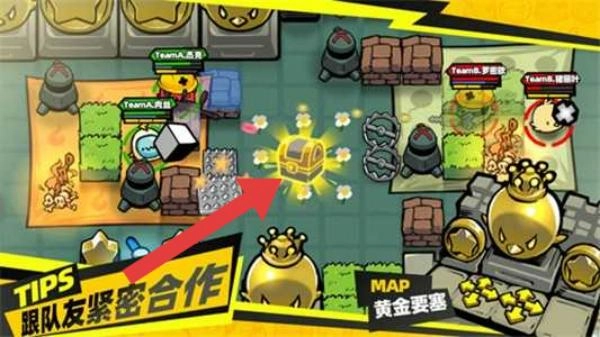 2、战斗中,跟随箭头,和队友合作,攻击发光宝箱,获取道具,推进“黄金要塞”等关卡,提升战力。
