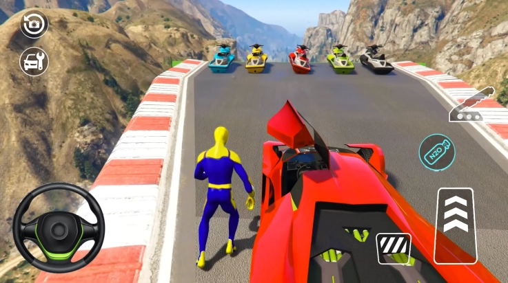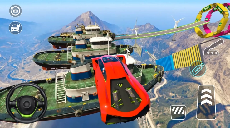2、巨型坡道汽车特技:于庞大的坡道之上,完成大胆的特技动作。在加速闯过每一个关卡的过程中,让汽车在空中进行跳跃、翻转以及旋转。