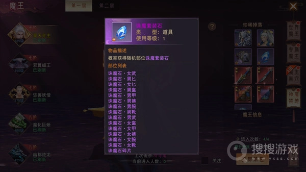 专属魔王:专属魔王每天可以挑战2次,首次击杀和挑战失败不消耗次数,只能单人挑战,三星通关可以获得翻倍奖励。自身等级越高,可挑战的魔王等级越高,奖励越好。