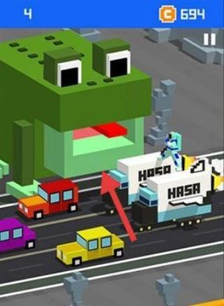 2、生存挑战:在第3、4、5关等各关卡中,玩家需要在车流以及特殊生物(如巨蛙、章鱼)之间寻找通路。若成功通过当前关卡,即可进入下一场景,并累计分数(分数会在界面上显示,例如“433”“694”等)。