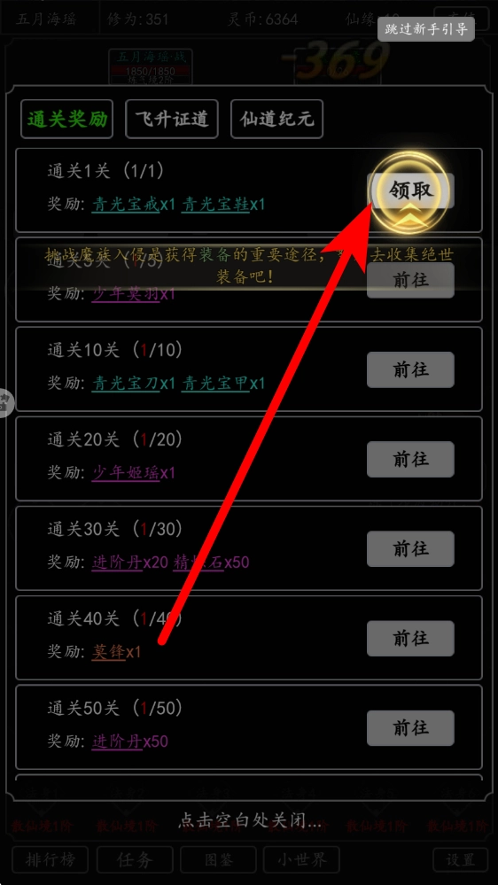 3、通关领奖:成功通过关卡后,会进入奖励界面,在此界面点击领取按钮,即可获得青光宝戒、青光宝鞋等装备或道具。这些物品能够强化角色的战斗力,助力您在修真之路上稳步前行。