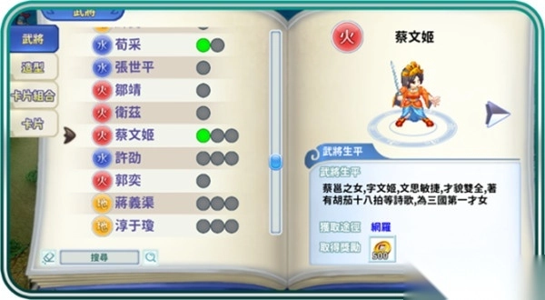 武将可通过游戏抽卡获得,其中包含荀采、張世平、鄒靖、衛茲、蔡文姬、許劭、郭奕、蒋義渠、淳于瓊。