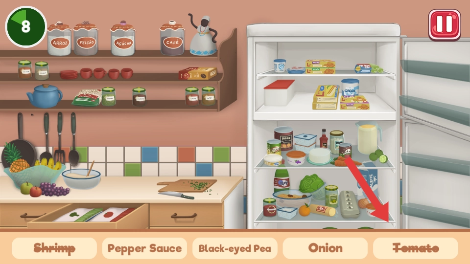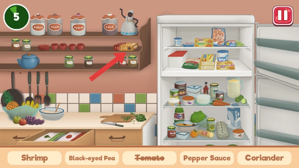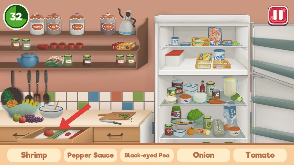 1. 当进入厨房场景,首先要检查冰箱与橱柜这两个核心区域。在冰箱里,能够获取像虾、黑眼豆这类需要冷藏的食材。