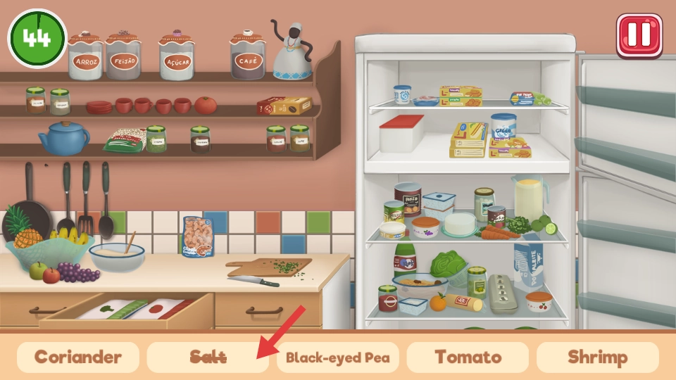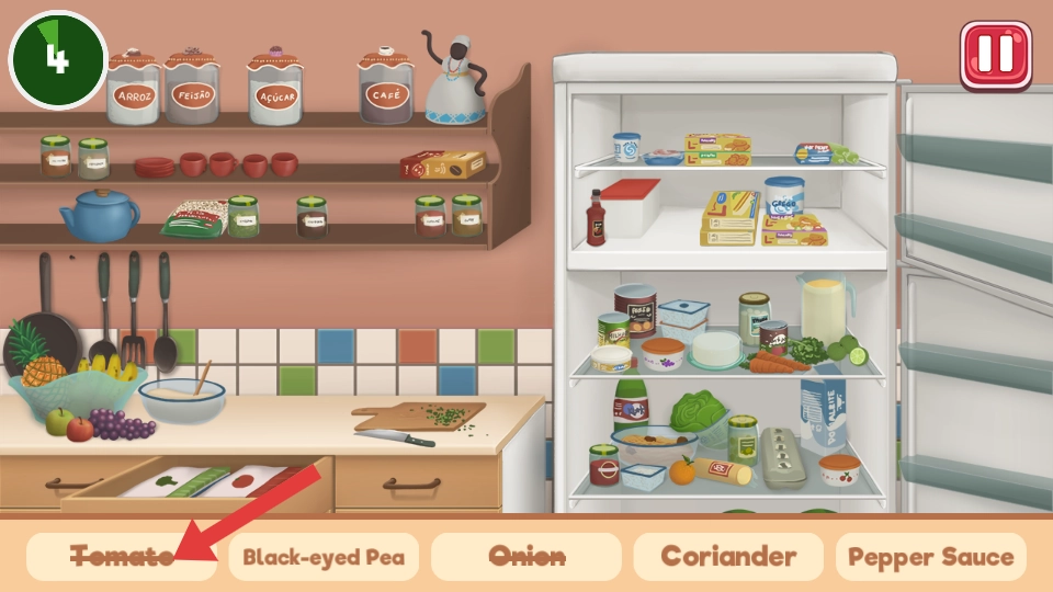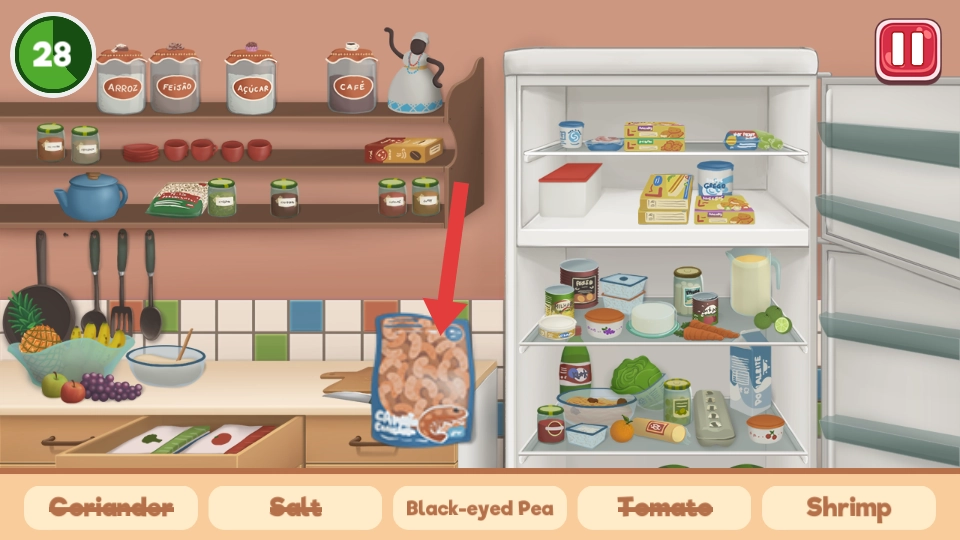 1. 当进入厨房场景后,首先要查看冰箱和橱柜。在冰箱中,可以找到虾以及部分酱料等需要冷藏的食材,而橱柜上放置着番茄和黑眼豆。