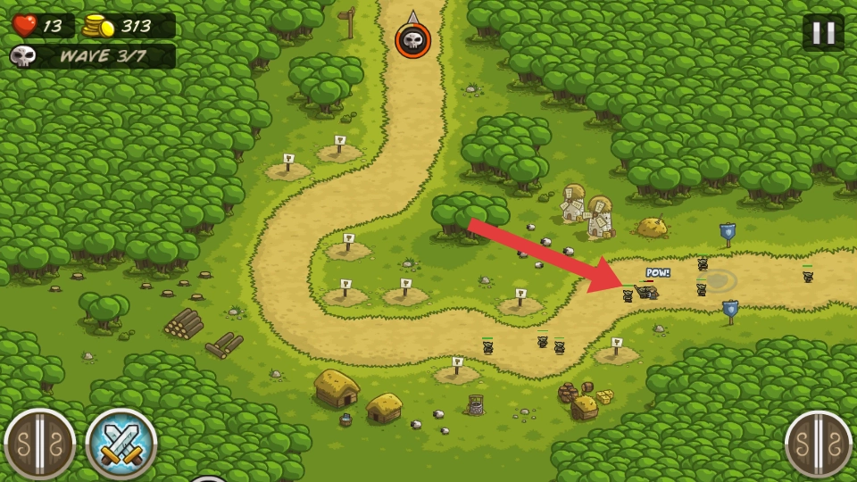 2、在战斗过程中,箭头所指向的防御塔区域,防御塔在此区域能够发挥其功能。敌人会顺着道路途经此地,防御塔于该区域可对敌人形成有效的打击。