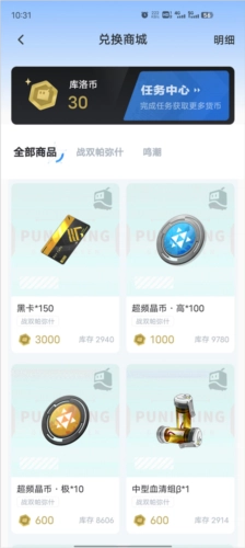 6、通过完成任务提升社区活跃度,能够获取库街区专属的“库洛币”。库洛币可在积分商城中,兑换游戏内的各类资源以及周边产品,像极为实用的血清、黑卡,还有战双挂画、鲨土碧儿坐垫、鼠标垫之类的物品。