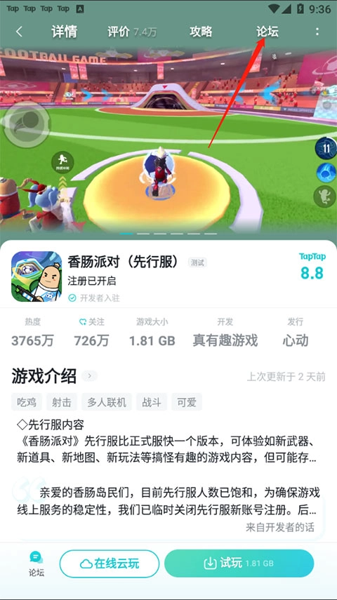 2. 找到并点击《香肠派对》游戏,接着点击游戏界面右上角的论坛。