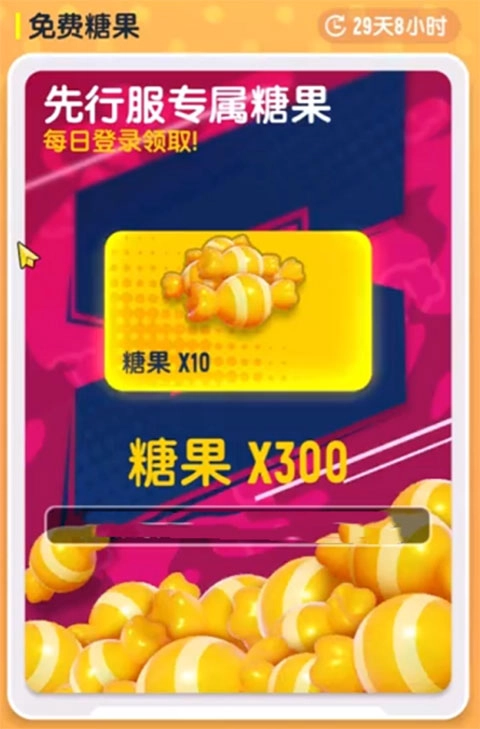 1、首先,先行服每日奖励为10颗糖果,可领取30天,总计300颗糖果。