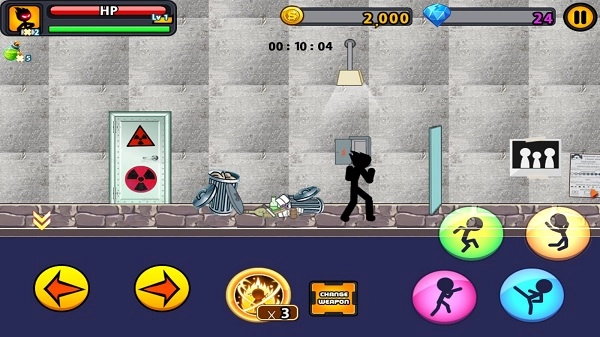 由于《愤怒的火柴人7》是该系列的延续之作,其操作依旧采用较为常见的虚拟摇杆控制方式。其中,屏幕左边的箭头负责控制方向,右边则是攻击与跳跃按钮。在UI设计上,相较于前几代更为形象直观,哪怕是新手玩家,依靠按钮的UI设计,也能够迅速上手。此外,在游戏里玩家能够购买各类武器,通过持续杀敌赚取金钱,进而对武器进行升级。