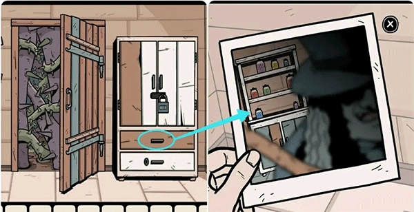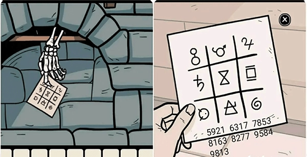 5、走到壁炉旁,揭开画框上的白布,随即进入剧情。之后,对着壁炉使用对讲机,会得到一张纸条。仔细观察纸条上的符号,再结合收音机的频道数字,就能得出由四个符号组成的密码。