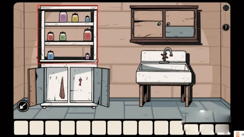2、推开那扇蓝色的门,走进盥洗室。依照照片上的提示,把架子上的罐子摆放好。完成这一步后,取走下方的钥匙。紧接着,打开水池上方的柜子,拿到对讲机。随后,走出盥洗室,用钥匙打开钟表左侧的门。