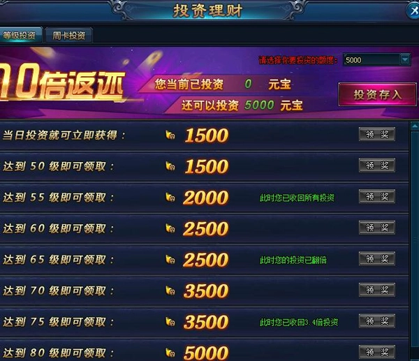 3、另外,在商城里也能够购买进阶材料。当然,这需要消耗元宝。不过,参与【投资理财】活动,投入5000元宝就能轻松获取22000元宝。这仅仅是80级的情况,后续85级投入5000元宝、90/95级投入6500元宝、100级投入10000元宝。