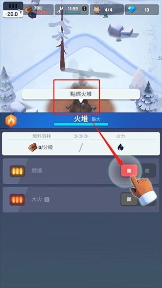 5、夜晚降临,气温急剧下降到不适宜的温度时,需将大火火力调至最大,以维持合理的生存温度。