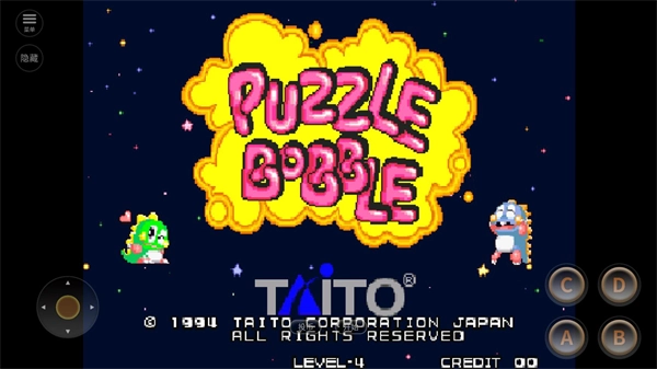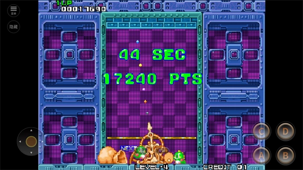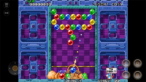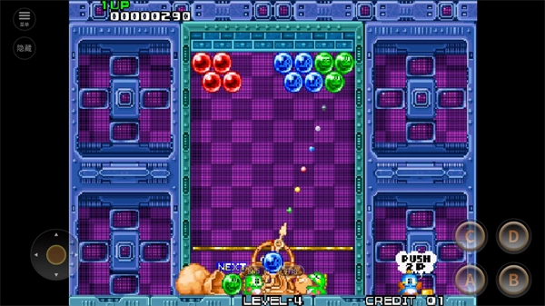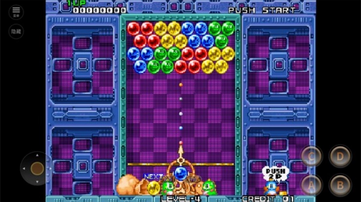 2、进入关卡后,通过点击坐标处的摇杆来操控发射方向,点击右侧的A键发射不同颜色的泡泡。
