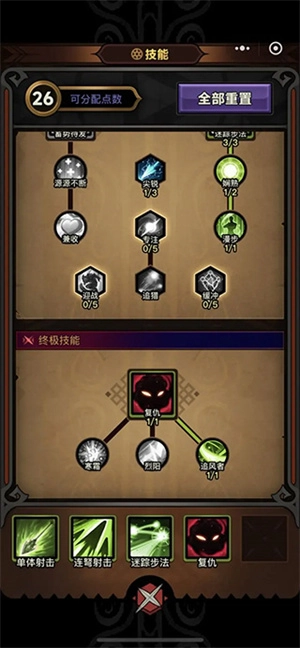1. 核心技能包含:多重射击、精准打击、蓄势待发以及复仇。