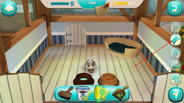 1、首先,进行狗狗训练时,要在狗屋中点击右侧的“导航条”,就是如下图所示的“梯子”图形。