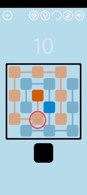 10、在第10关,点击方块之间的空隙,就会出现连接线。点击连接线,能让它改变方向。连接线能够把方块连接起来,与彩色方块相连的方块会转变为彩色。当所有方块都变为彩色时,即可通关。有一种通关方式如下图所示。红宝石藏在某一个随机的黑色方块里,当这个方块变成彩色时,会在图中红圈位置显示出红宝石的轮廓,随后点击该方块,就能拿到红宝石。
